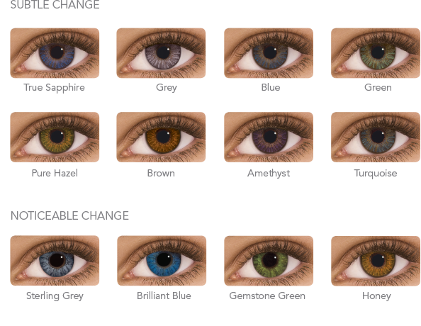 SUBTLE: True Sapphire, Grey, Blue, Green, Purehazel, Brown, Amethyst, Turquoise.